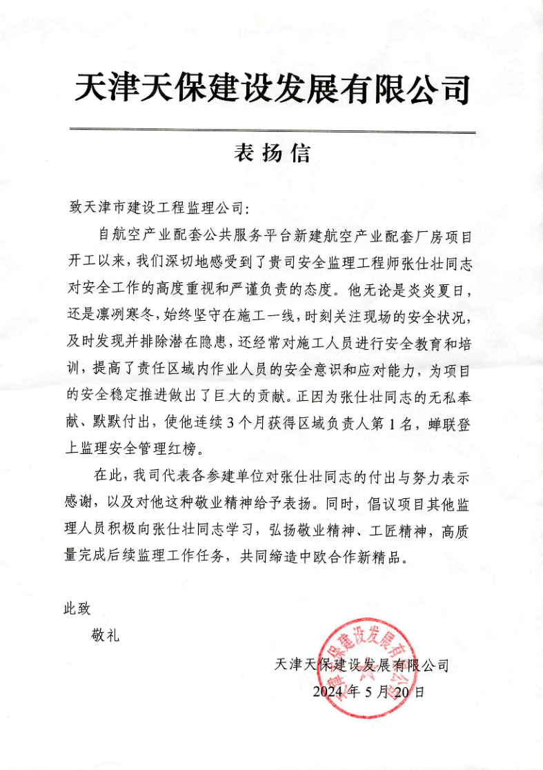 近期,我司航空產(chǎn)業(yè)配套公共服務(wù)平臺(tái)新建航空產(chǎn)業(yè)配套廠房項(xiàng)目監(jiān)理部收到建設(shè)單位天津天保建設(shè)發(fā)展有限公司發(fā)出的對(duì)本項(xiàng)目安全監(jiān)理工程師張仕壯同志的表?yè)P(yáng)信,信中提到:張仕壯同志對(duì)安全工作的高度重視,時(shí)刻關(guān)注現(xiàn)場(chǎng)安全狀況,及時(shí)發(fā)現(xiàn)并排除潛在隱患,為本項(xiàng)目樹立了榜樣。